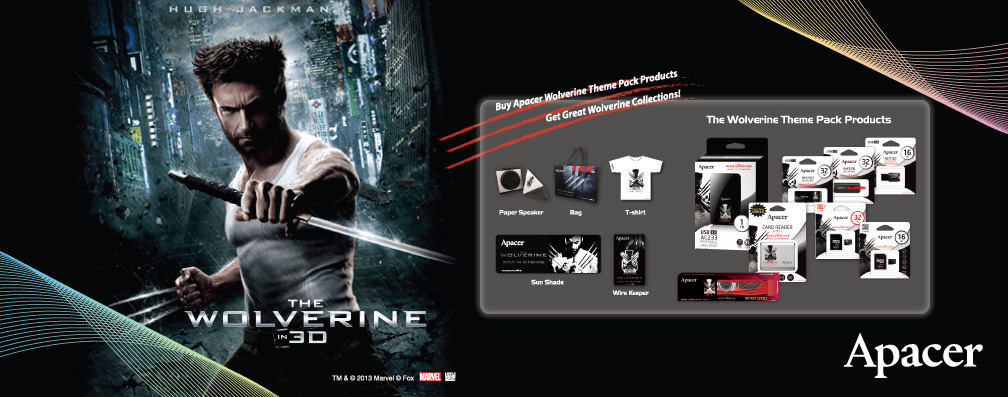 (กรกฎาคม 2013 ไทเป) Apacer ผู้นำนวตกรรมในด้านอุปกรณ์ดิจิตอลสตอเรจ ได้จับมือร่วมกับ 20th Century Fox เป็นครั้งที่ 4 ในปี 2013 นี้ กับการติดตามการเดินทางของตัวละครอย่าง “Wolverine” ที่นำแสดงโดย Hugh Jackman ไปยังประเทศญี่ปุ่น เพื่อตามหาความทรงจำที่หายไปของเขา ด้วยความร่วมมือจากค่ายหนังชั้นนำอย่าง 20th Century Fox กับการเปิดตัวภาพยนตร์ Wolverine ทั่วโลก ทำให้ Apacer ได้เริ่มแคมเปญ “fierce fight in Japan, pursuing lost memories” ใน 15 ประเทศทั่วโลก ซึ่งใครก็ตามที่ได้ซื้อสินค้าของ Apacer รุ่น Limited edition ในธีม Wolverine จะได้รับโอกาสที่จะได้รับเสื้อยืด T-Shirt พิเศษ ตลอดจนชุดเก็บสายเฮดโฟน แว่นตากันแดด ลำโพงกระดาษแบบ DIY กระเป๋าลาย Wolverine และอื่นๆอีกมากมาย จนกว่าสินค้าจะหมด