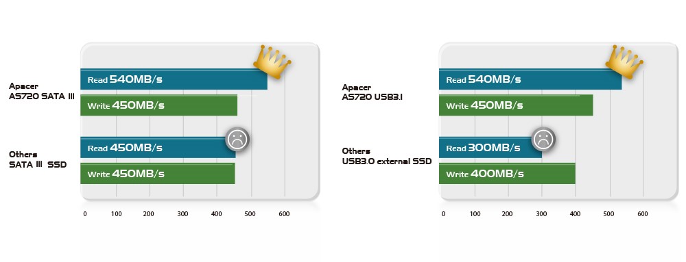 AS720 คือ SSD รุ่นแรกที่มี SATA III และ TYPE-C USB3.1 ในตัว AS720 คัดเลือก flash chip คุณภาพสูง และใช้ interface สำหรับการถ่ายโอนข้อมูลแบบ two-in-one high-speed จากการทดสอบผ่าน interface แบบ SATA III สามารถอ่านได้สูงสุด 540MB/s. และการเขียนแบบ sequential สูงสุดถึง 450MB/s AS720 สามารถย้ายไฟล์ขนาดใหญ่สำหรับการตัดต่อได้อย่างทันใจ AS720สามารถเชื่อมต่อกับ Mac หรือ Windows ได้ และด้วยความเร็วที่สูงขนาดนี้คุณสามารถทำการตัดต่อไฟล์ไฟล์บน SSD โดยไม่จำเป็นต้องคัดลอกไฟล์สู่ SSD ให้เสียเวลา ด้วยความเร็วระดับแนวหน้าในการอ่าน/เขียนที่สูงถึง 540/450MB/s. เมื่อเชื่อมต่อแบบ USB3.1 ยกตัวอย่างเช่น การ copy ไฟล์ HD video ขนาด 5GB ใช้เวลาต่ำกว่า 15 วินาที ผู้ใช้งานสามารถมีความสุขกับความเร็วสูงในการเปิดเครื่อง หรือการใช้งาน ทั้งในที่ทำงาน และเวลาพักผ่อน