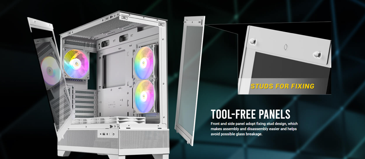 แผงกระจกด้านหน้า และด้านข้างใช้การออกแบบที่ไม่ต้องใช้เครื่องมือ และอุปกรณ์ในการถอดชิ้นส่วน ซึ่งทำให้ง่ายต่อการประกอบ และช่วยหลีกเลี่ยงการแตกหักของกระจกที่อาจเกิดขึ้นได้
