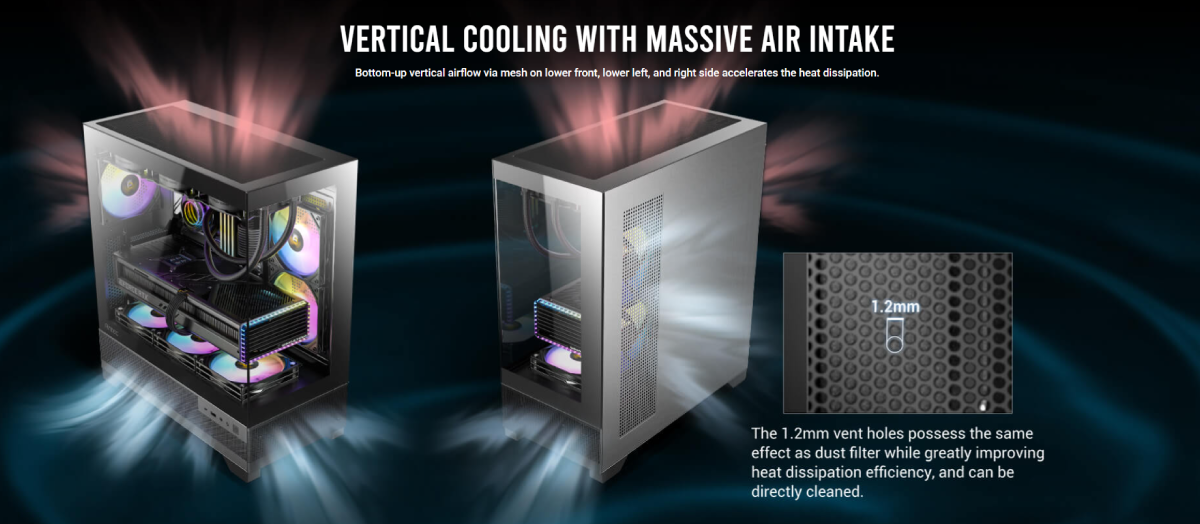 แผงตะแกรงด้านล่าง มีการออกแบบความถี่อยู่ที่ 1.2mm เพื่อช่วยการไหลเวียนของอากาศในแนวตั้ง จากด้านล่างขึ้นด้านบน และแผงตะแกรงฝาข้างของตัวเคส ช่วยเรื่องการกระจายความร้อนให้ดีมากยิ่งขึ้น