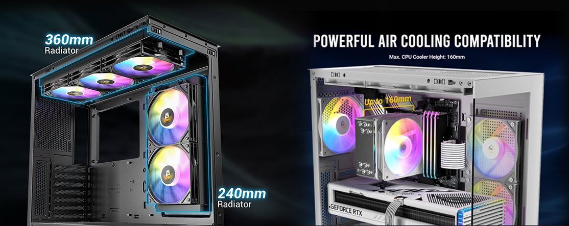 รองรับการติดตั้งชุดระบายความร้อนด้วยน้ำด้านบนขนาด 120 / 240 / 280 / 360mm และด้านข้างขนาด 120 / 240mm (ความยาวของกราฟิกการ์ดจะถูกจำกัดไว้ที่ 270mm) และรองรับ CPU Air Cooling สูงสุดที่ 160mm