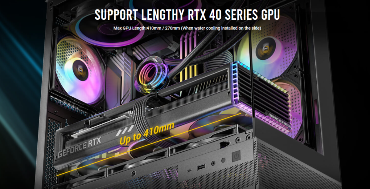 สำหรับเคส ANTEC CX700 RGB ELITE สามารถรอบรองการติดตั้งการ์ดจอ RTX 40 SERIES ได้สบาย ๆ สามารถรองรับได้สูงสุดถึง 410mm แต่หากติดตั้งชุดระบายความร้อนด้วยน้ำด้านข้าง จะโดนจำกัดความยาวของการ์ดจอได้สูงสุดเพียง 270mm