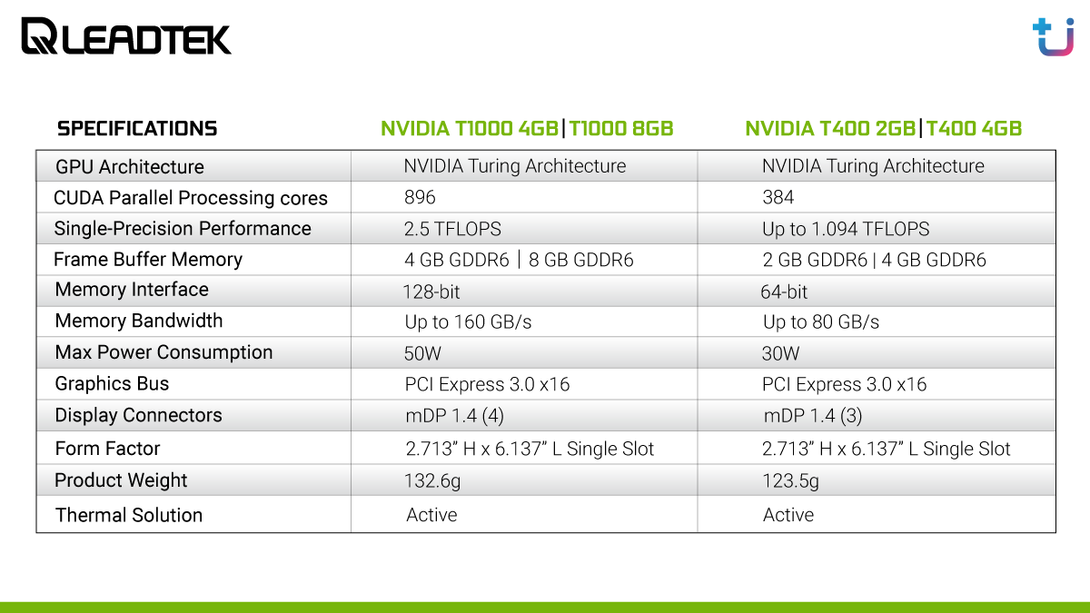LEADTEK NVDIA RTX T400 2GB ราคา 4,390 บาท / 4GB ราคา 5,890 บาท มี 384 CUDA Cores หน่วยความจำ GDDR6 2GB หรือ 4GB รองรับสูงสุด 3 จอ รายละเอียดสูงสุด 5K