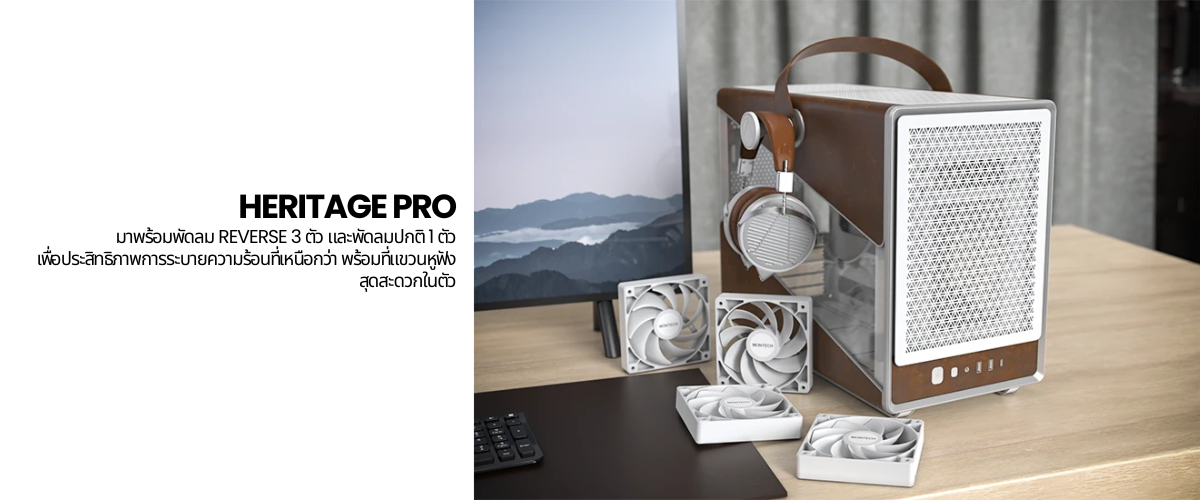 ระบบระบายความร้อนที่ครบครัน พร้อมฟังก์ชันเสริมที่ใส่ใจ Heritage PRO มาพร้อมพัดลมขนาด 120mm จำนวน 4 ตัวจากโรงงาน โดยแบ่งเป็น 3 ตัวแบบใบพัด Reverse ที่ติดตั้งด้านล่าง และ 1 ตัวด้านหลัง เสริมออปชันการใช้งานด้วย ที่แขวนหูฟัง ที่ติดตั้งเข้ากับสายหิ้วได้อย่างลงตัว
