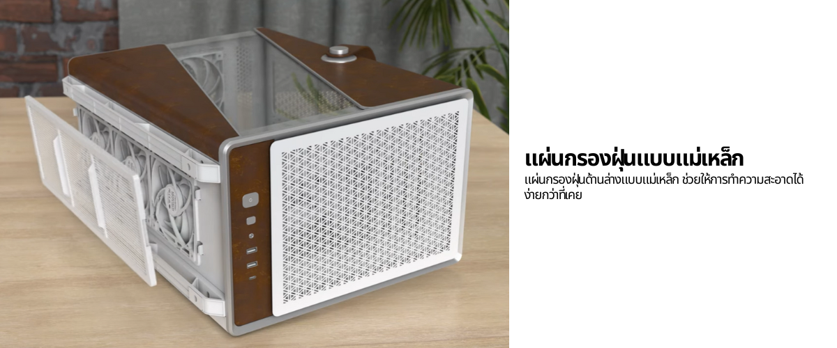 ด้านล่างของเคสมีแผ่นกรองฝุ่นแบบแม่เหล็ก ช่วยให้การทำความสะอาดได้ง่าย ด้านหน้าของเคส Heritage PRO มาพร้อมพอร์ตที่ครบครัน พร้อมใช้งานทันที
