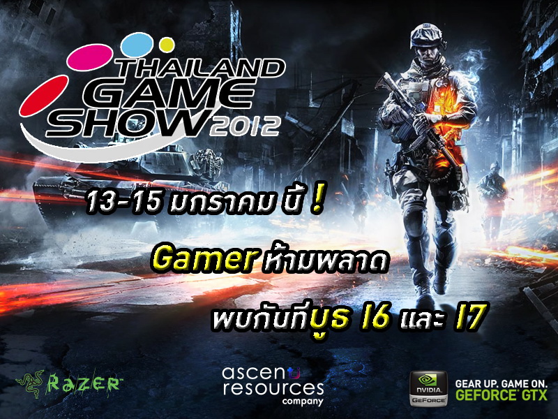 สวัสดีชาวเกมเมอร์ทุกท่าน อีกไม่กี่วันมหกรรมงานเกมสุดยิ่งใหญ่ Thailand Game Show 2012 ก็จะเริ่มขึ้นแล้ว ทางบริษัทเอสเซนตี้ รีซอร์สเซส จัดหนักอีกเช่นเคย นำทีมโดยสุดยอดชิปกราฟฟิกจากค่าย Nvidia และอุปกรณ์ Gaming Gear ระดับโลกอย่าง Razer มาจัดแสดงโชว์และโปรโมชั่นอีกเพียบ !!