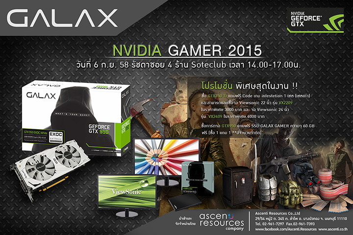 บริษัท เอสเซนตี้ รีซอร์สเซส จำกัด ผู้นำเข้าและจัดจำหน่าย สินค้าไอที แบรนด์ดังระดับโลก ร่วมกับ GALAX และ NVIDIA จัดโปรโมชั่นสุดพิเศษ!! เอาใจชาวค่ายกราฟิกการ์ดค่ายเขียว เพียงซื้อ GALAX GTX950 EXOC White ที่งาน NVIDIA GAMER 2014 รับทันที SSD GALAX GAMER 60 GB ฟรี!! ณ SOTECLUB (รัชดาซอย4) ในวันอาทิตย์ ที่ 6 กันยายน 2558 ตั้งแต่เวลา 14.00 – 17.00 น.