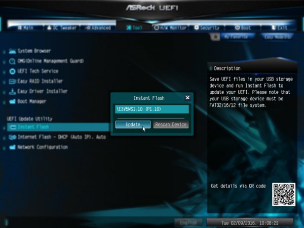 เช่นเดียวกับเมนบอร์ด ASRock ซึ่งเป็นแบบ UEFI BIOS ก็สามารถอัพเดตไบออสให้เป็นเวอร์ชั่นใหม่ล่าสุดได้เช่นเดียวกัน โดยใช้เครื่องมือที่เรียกว่า ASRock Instant Flash ที่มีมาบนเมนบอร์ด ทำให้การแฟลชไบออสหรืออัพเดตไบออสทำได้ง่ายขึ้น การเข้าถึงโหมดดังกล่าวได้ด้วยการกดปุ่ม F6 เมื่อเริ่มเปิดเครื่อง จากนั้นไปที่ Tool แล้วเลือก Instant Flash ที่อยู่ในหัวข้อ UEFI Update Utility