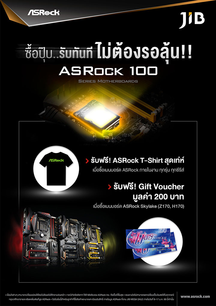ASRockผู้ผลิตเมนบอร์ดชั้นนำระดับโลก อัดโปรโมชั่นพิเศษต้นปี ขอบคุณลูกค้าเมนบอร์ดในงาน J.I.B. MEGA SALE ด้วยของรางวัลมากมายที่ทาง ASRockจัดไว้ให้กับผู้ที่ซื้อเมนบอร์ดภายในงาน พร้อมเชิญร่วมสัมผัสประสบการณ์เทคโนโลยีเมนบอร์ดล่าสุดจาก ASRockภายในพื้นที่กิจกรรมของทาง J.I.B. และพบกันได้ที่งาน J.I.B. MEGA SALE จัดขึ้น ณ บริเวณ ลานโปรโมชั่น ชั้น2 ศูนย์การค้าเซียร์รังสิต ตั้งแต่วันที่ 8 - 17 มกราคม 2559 นี้