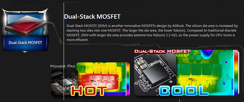 Dual-Stack MOSFET (DSM) เป็นนวัตกรรมใหม่ในการออกแบบ MOSFET ซึ่งพื้นที่ภายในมีแกนซิลิกอนสองชั้นอยู่ใน MOSFETโดยที่ die มีพื้นที่มากขึ้นและมีความต้านทานต่ำ เมื่อเทียบกับ MOSFET แบบเดิมและ DSM กับพื้นที่ die ที่มากขึ้น จึงให้ความต้านทานต่ำเป็นพิเศษเพียง 1.2mΩเท่านั้น ดังนั้นจึงทำให้เพาเวอร์ซัพพลายจ่ายไฟให้กับซีพียูได้มีประสิทธิภาพยิ่งขึ้น