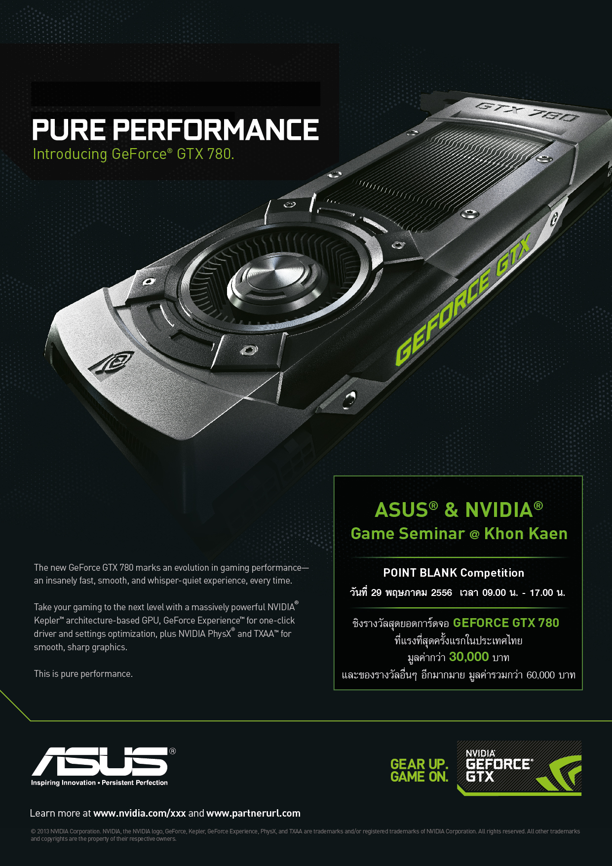 กรุงเทพฯ (24พฤษภาคม2556) – กลุ่มธุรกิจโอเพ่น แพลทฟอร์ม (โอพีบีจี) บริษัทเอซุสเทค คอมพิวเตอร์ (ประเทศไทย) จำกัด ผู้จัดจำหน่ายอุปกรณ์เกมมิ่งชั้นนำภายใต้แบรนด์ “เอซุส” จับมือพันธมิตร “NVIDIA” ร่วมสร้างปรากฏการณ์ครั้งแรกของเมืองไทยกับการเผยโฉมสุดยอดกราฟฟิกส์การ์ดรุ่นล่าสุด “ASUS GeForce GTX780” โดยจะทำการเปิดตัวครั้งแรกและเปิดโอกาสให้นักเล่นเกมได้สัมผัสกับเทคโนโลยีและเป็นเจ้าของได้แล้วกับการแข่งขัน“ASUS & NVIDIA Game Seminar @ KhonKaen”กิจกรรมสุดมันส์ที่เปิดรับสมัครให้เหล่าเกมเมอร์ได้เข้าร่วมประลองฝีมือในเกม Point Blank เพื่อชิงของรางวัลสุดพิเศษเป็นสุดยอดการ์ดจอ “ASUS GeForce GTX780” ที่มีมูลค่าถึง 30,000 กว่าบาท! และยังแจกของรางวัลอื่นๆ อีกมากมายจากเอซุส รวมมูลค่าทั้งสิ้นกว่า 60,000 บาท
