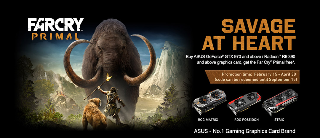 ไทเป, ไต้หวัน (15 กุมภาพันธ์ 2559)–วันนี้ทาง ASUS ได้ประกาศเปิดตัวโปรโมชั่นสุดพิเศษ สำหรับผู้ที่ซื้อ กราฟิกการ์ดNVIDIA® GeForce® GTX™ Titan Z / Titan X / 980 Ti / 980 / 970 หรือ AMD® Radeon™ R9 Fury X / Fury / Nano / 390X / 390ในระหว่างวันนี่ 15 กุมภาพันธ์ จนถึง 30 เมษายน 2559จะได้รับฟรี เกม Far Cry Primal®แบบคีย์เกม ทาง Uplayโดยการลงทะเบียนที่เว็บไซต์1(www.asus.com/event/VGA/far-cry-primal/) ตั้งแต่วันที่ 4 มีนาคม 2559คีย์เกมจะสามารถใช้ได้จนถึงวันที่ 15 กันยายน 2559 โดยสามารถดาวน์โหลดได้ผ่านทางแอพลิเคชั่นUplay PC (www.uplay.com) โดยโปรโมชั่นนี้สามารถใช้ได้ในทุกประเทศในทวีปยุโรปและเอเชียแปซิฟิก ยกเว้น ประเทศจีน