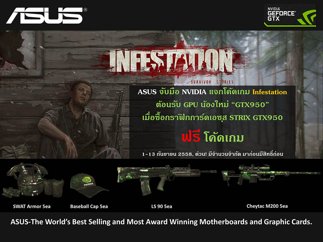ASUS จับมือ NVIDIA แจกโค้ดเกม Infestation เพื่อเป็นการต้อนรับ GPU น้องใหม่ GTX950 โดยเฉพาะ จำนวน 450 โค้ดเท่านั้นสำหรับลูกค้าที่ซื้อ STRIX GTX950 สามารถลงทะเบียนรับโค้ดเกม Infestation ได้ที่ ASUS ROG Thailand แฟนเพจ www.facebook.com/ASUS.DIY/photos/a.222178411161294.56095.216707628375039/932818186763976/?type=1&theater