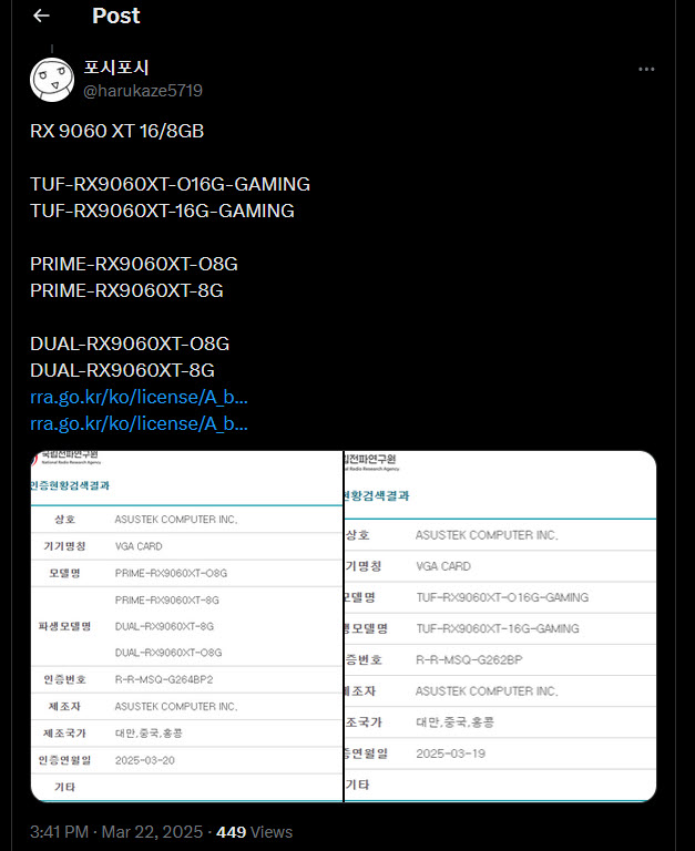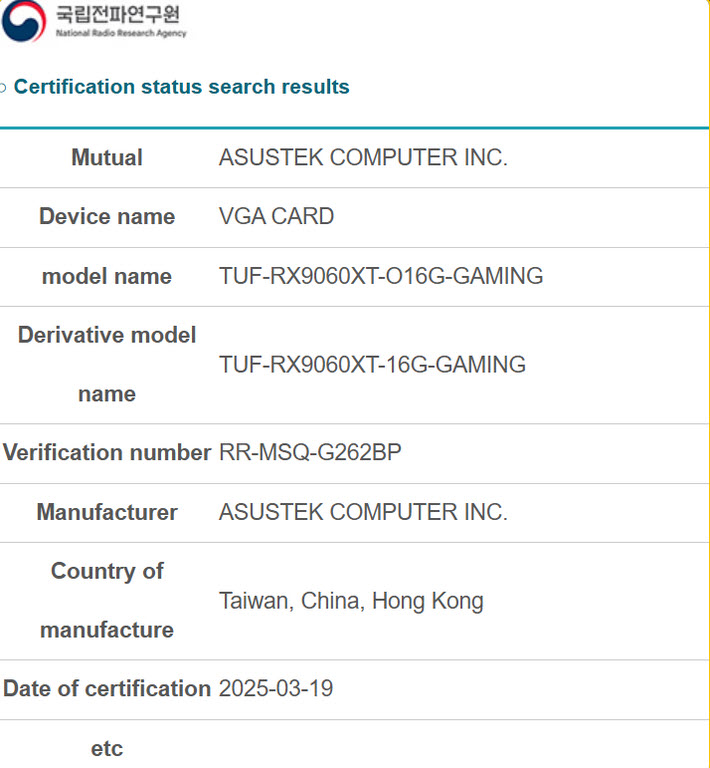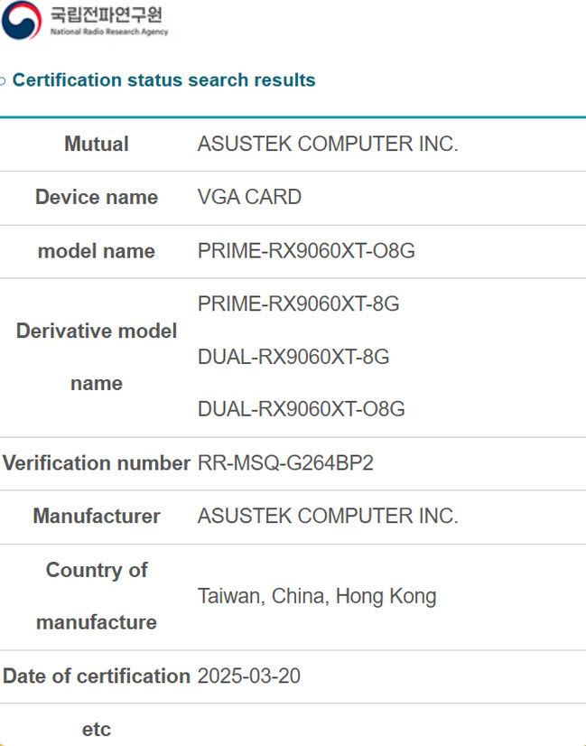 วันนี้ก็มีข่าวจากฝั่ง ASUS หลุดออกมาให้เราได้ชมกันครับกับข่าวของการ์ดจอ AMD Radeon RX 9060 XT รุ่นใหม่ที่ยังไม่เปิดตัวที่ปรากฏในข้อมูลของ RAA หรือ south korea Radio Agency ที่มีข้อมูลรายละเอียดของการ์ดจอ ASUS Radeon RX 9060 XT DUAL, TUF และ PRIME 3ซีรี่ย์ที่มีทั้งรุ่นแรม 16GB และ 8GB ทั้งหมด 6รุ่นที่หลุดออกมาครับ ในรหัส RX 9060 XT 16/8GB , TUF-RX9060XT-O16G-GAMING , TUF-RX9060XT-16G-GAMING , PRIME-RX9060XT-O8G , PRIME-RX9060XT-8G , DUAL-RX9060XT-O8G , DUAL-RX9060XT-8G สำหรับการเปิดตัวคาดว่าจะมีขึ้นในเร็วๆ นี้