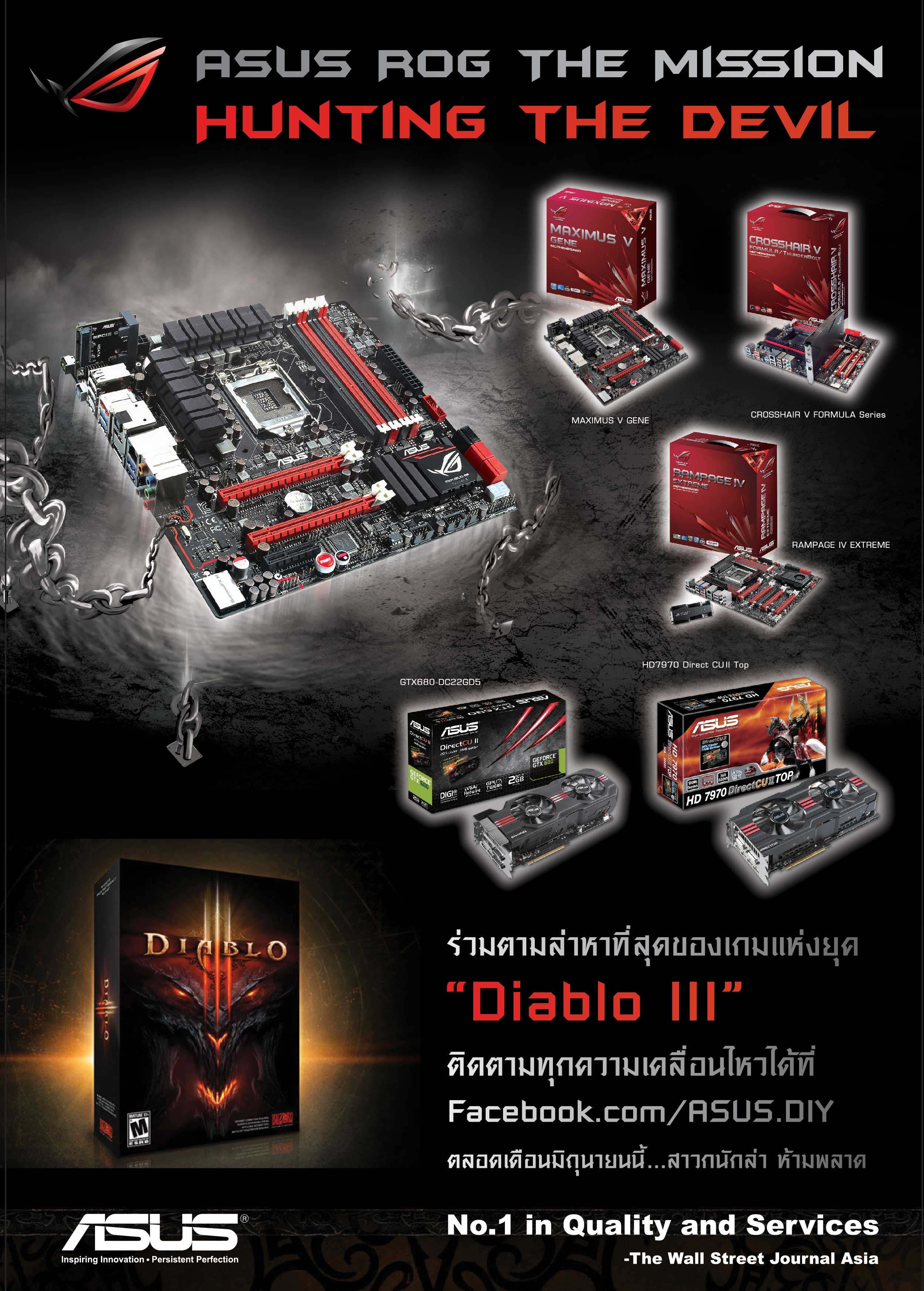 กรุงเทพฯ (11 มิถุนายน 2555) - เอซุส โอพี คืนกำไรให้กับลูกค้าด้วยโปรโมชั่นร่วมสนุกชิงเกมแนวดาร์ค แฟนตาซีสุดมันส์แห่งยุค “Diablo III” ในกิจกรรมแอ็คชั่นผจญภัยล่าปีศาจข้ามมิติ “ASUS ROG The Mission: Hunting the Devil” ชวนเหล่าสาวกนักล่าที่ซื้อผลิตภัณฑ์เกมมิ่งจากเอซุสในช่วงเดือนมิถุนายนนี้ ลุ้นรับเกม “Diablo III” กลับไปมันส์กันต่อ สัปดาห์ละ 10 กล่อง มูลค่ากล่องละ 2,100 บาท รวมทั้งหมด 30 รางวัล โดยผู้สนใจร่วมกิจกรรมดังกล่าว สามารถอ่านกติกาและร่วมสนุกได้ทุกสัปดาห์ เริ่มตั้งตั้งวันที่ 11-30 มิถุนายนนี้บนเฟซบุ๊คแฟนเพจของเอซุสที่ Facebook.com/ASUS.DIY พร้อมร่วมสัมผัสประสบการณ์สุดยอดเกมมิ่งจากผลิตภัณฑ์ล้ำนวัตกรรมของเอซุส ทั้งมาเธอร์บอร์ด วีจีเอการ์ด จอแอลซีดี ฯลฯ ได้ที่ตัวแทนจำหน่ายทั่วประเทศ ดูข้อมูลผลิตภัณฑ์เพิ่มเติมได้ที่ www.asus.co.th หรือพูดคุยผ่านทาง www.facebook.com/ASUS.DIY