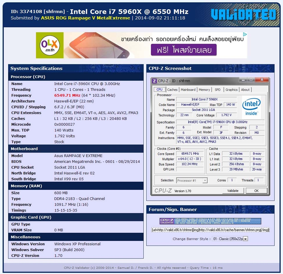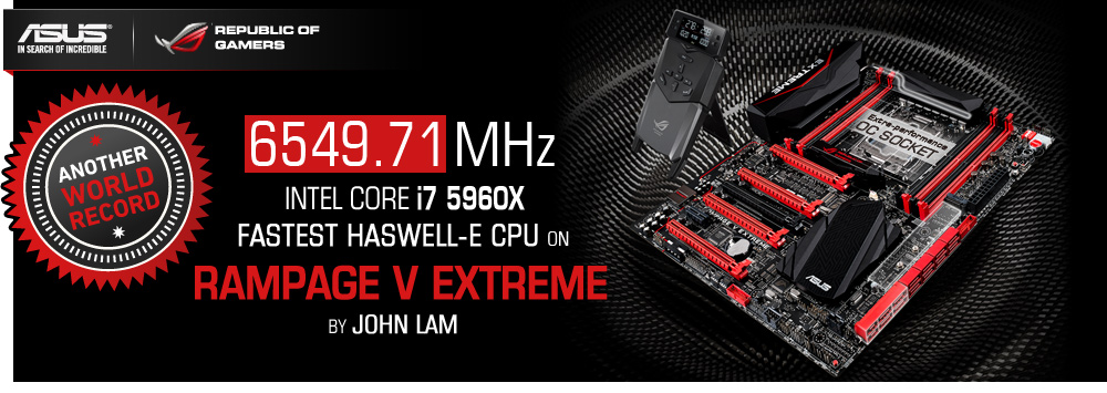 ไทเป, ไต้หวัน – 2 ก.ย. 2557 – นักโอเวอร์คล็อก ยอดฝีมือชาวฮ่องกง Mr. John Lam ได้ทำการโอเวอร์คล็อกCPU Intel core i7-5960X รุ่นใหม่ล่าสุด ทะลุเพดานสถิติใหม่ที่ความเร็ว6549.71 MHz (เพิ่มขึ้นจากมาตรฐาน118.32%) บนมาเธอร์บอร์ด Rampage V Extreme ที่พิเศษกว่าด้วย OC Socket LGA2011-V3 (Haswell E)