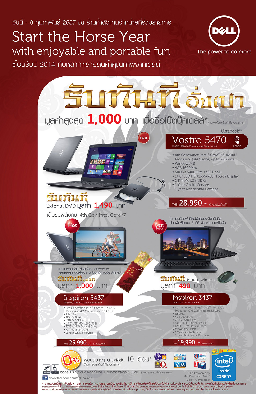 บริษัท เดลล์ คอร์ปอเรชั่น (ประเทศไทย) จำกัด ร่วมกับ อินเทล ต้อนรับเทศกาลตรุษจีนปีม้าทอง ที่กำลังจะมาถึง ด้วยการมอบอั่งเปามูลค่าสูงสุด 1,000 บาท พร้อมของสมนาคุณหลากหลายรายการ แก่ผู้ที่ซื้อ โน๊ตบุ๊คเดลล์รุ่นที่ร่วมรายการ อาทิ Dell Inspiron 5437 (W560707TH) รับทันทีอั่งเปา มูลค่า 1,000 บาท, Dell Inspiron 3437 (W560702TH) รับทันที Mouse Wireless มูลค่า 490 บาท และ Dell Vostro 5470 รับทันที External DVD มูลค่า 1,490 บาท แถมยังผ่อน 0% ได้นานสูงสุด 10 เดือนกับบัตรเครดิต ที่ร่วมรายการ ตั้งแต่วันนี้ถึง 9 กุมภาพันธ์ 2557 ทั้งนี้ ผู้สนใจสามารถ ชมรายละเอียดเพิ่มเติมได้ที่ www.facebook.com/DellThailand หรือ www.ilovedell.com