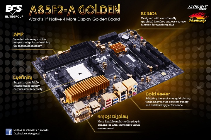 ในวันที่ 14 กันยายน 2555 ณ ประเทศไต้หวัน, กรุงไทเป - Elitegroup Computer Systems (ECS) ในวันนี้ได้เผยผลิตภัณฑ์ใหม่ล่าสุดของ Black Series ในชิปเซ็ท AMD FM2 - Golden Limited Edition: A85F2-A GOLDEN ที่ได้ถูกสร้างขึ้นมาพร้อมกับประสิทธิภาพการทำงานที่แรงของเมนบอร์ด FM2 โดยเพิ่มประสิทธิภาพของฟีเจอร์ใหม่ในเทคโนโลยีแพล็ทฟอร์ม Trinity และประยุกต์ในการใช้เทคโนโลยีของการใช้ทองเป็นส่วนประกอบพิเศาสำหรับคุณภาพที่สมบูรณ์แบบและประสิทธิภาพที่เกินคาด