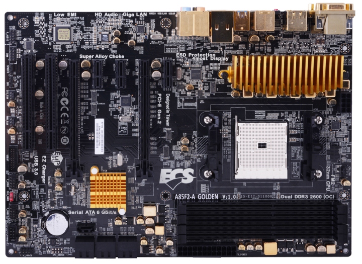 ECS A85F-2A GOLDEN เป็นอีกหนึ่งเมบอร์ดที่มีประสิทธิภาพสูงและน่าเชื่อถือสำหรับเกมมิ่งโซลูชั่น ในฟอร์แม็ท ATX ของเมนบอร์ด ECS นี้มีฟีเจอร์ที่ประกอบด้วย PCIe x16 จำนวน 2 สล็อทสำหรับกราฟิกการ์ดที่ได้มีการอัพเกรดและรองรับการทำ CrossFireX จนถึง PCIe x1 จำนวน 3 สล็อทสำหรับความต้องการที่แตกต่างออกไป Memory DDR3 แบบ Dual-channel ที่รองรับได้สูงถึง 64GB ที่สามารถติกตั้งบน 4 DIMMs พร้อมกับความเร็วสูงสุดจาก 1866 เป็น 2133 หรือสูงได้ถึง 2600 สำหรับการโอเวอร์คล๊อกแบบ high-end