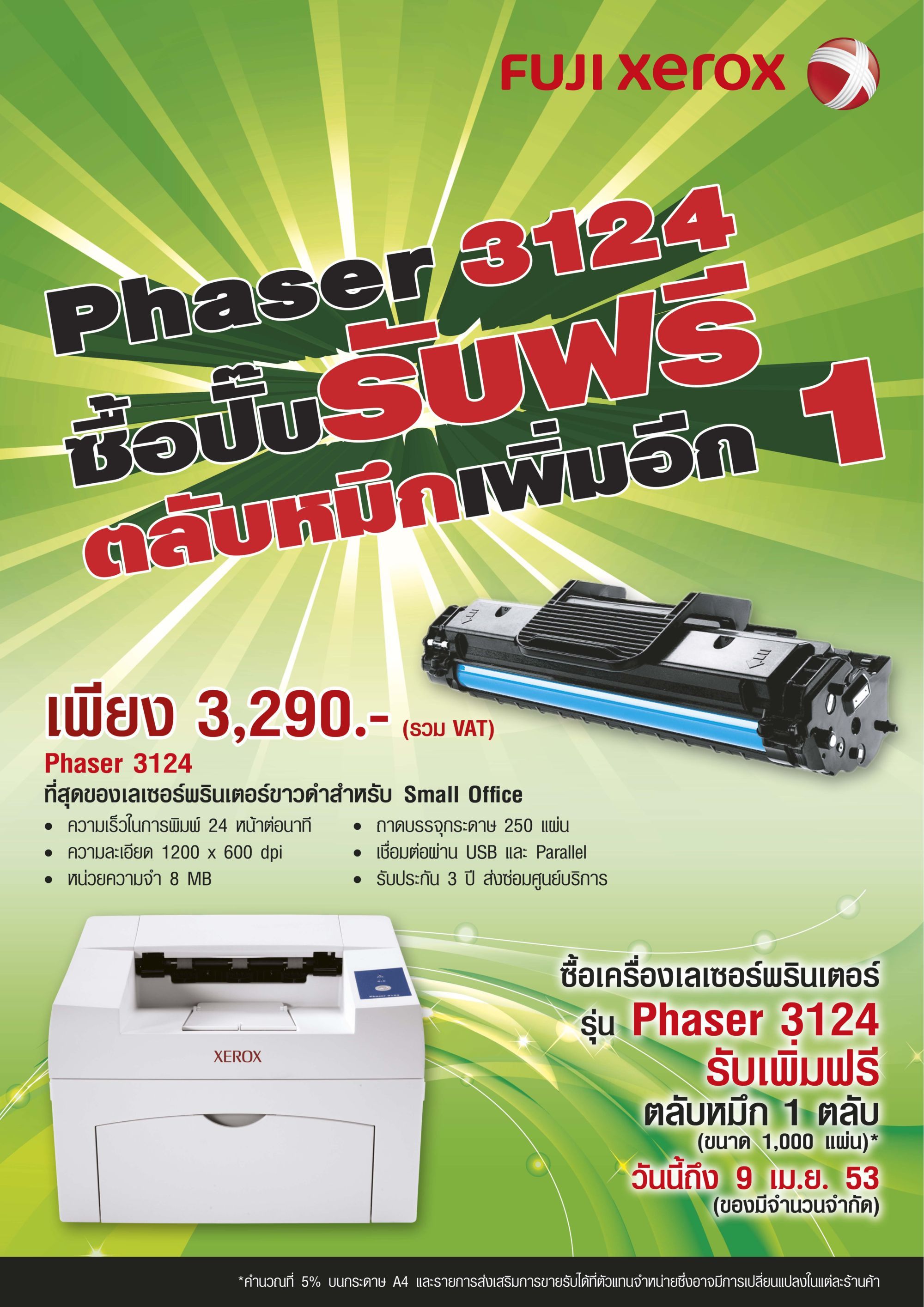 ฟูจิ ซีร็อกซ์ พรินเตอร์ ผู้นำเทคโนโลยีด้านการพิมพ์ระดับโลก เสนอโปรโมชั่นพิเศษ “ซื้อปั๊บรับฟรีตลับหมึกเพิ่มอีก 1″ สมนาคุณลูกค้าที่ซื้อเครื่องพิมพ์เลเซอร์ขาว-ดำ รุ่น Phaser 3124 ในราคาเพียง 3,290 บาท (รวมภาษีมูลค่าเพิ่ม) รับฟรีทันทีตลับหมึก (ขนาด 1,000 แผ่น) 1 ตลับ พร้อมรับประกัน 3 ปี
