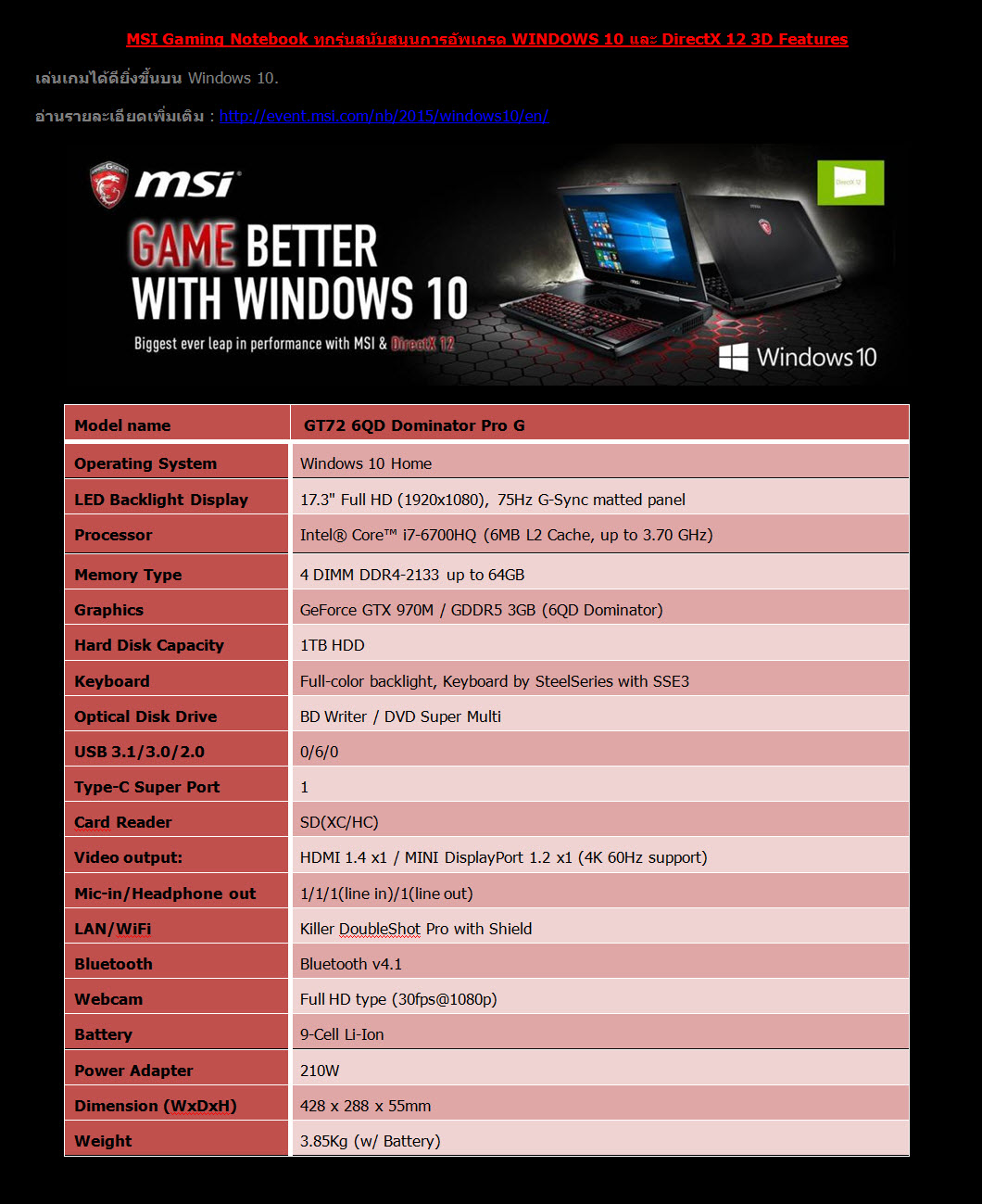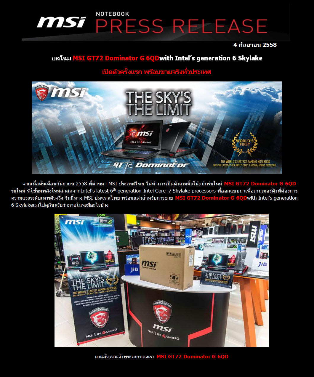 ยลโฉม MSI GT72 Dominator G 6QD with Intel’s generation 6 Skylake เปิดตัวครั้งแรก พร้อมขายจริงทั่วประเทศ
