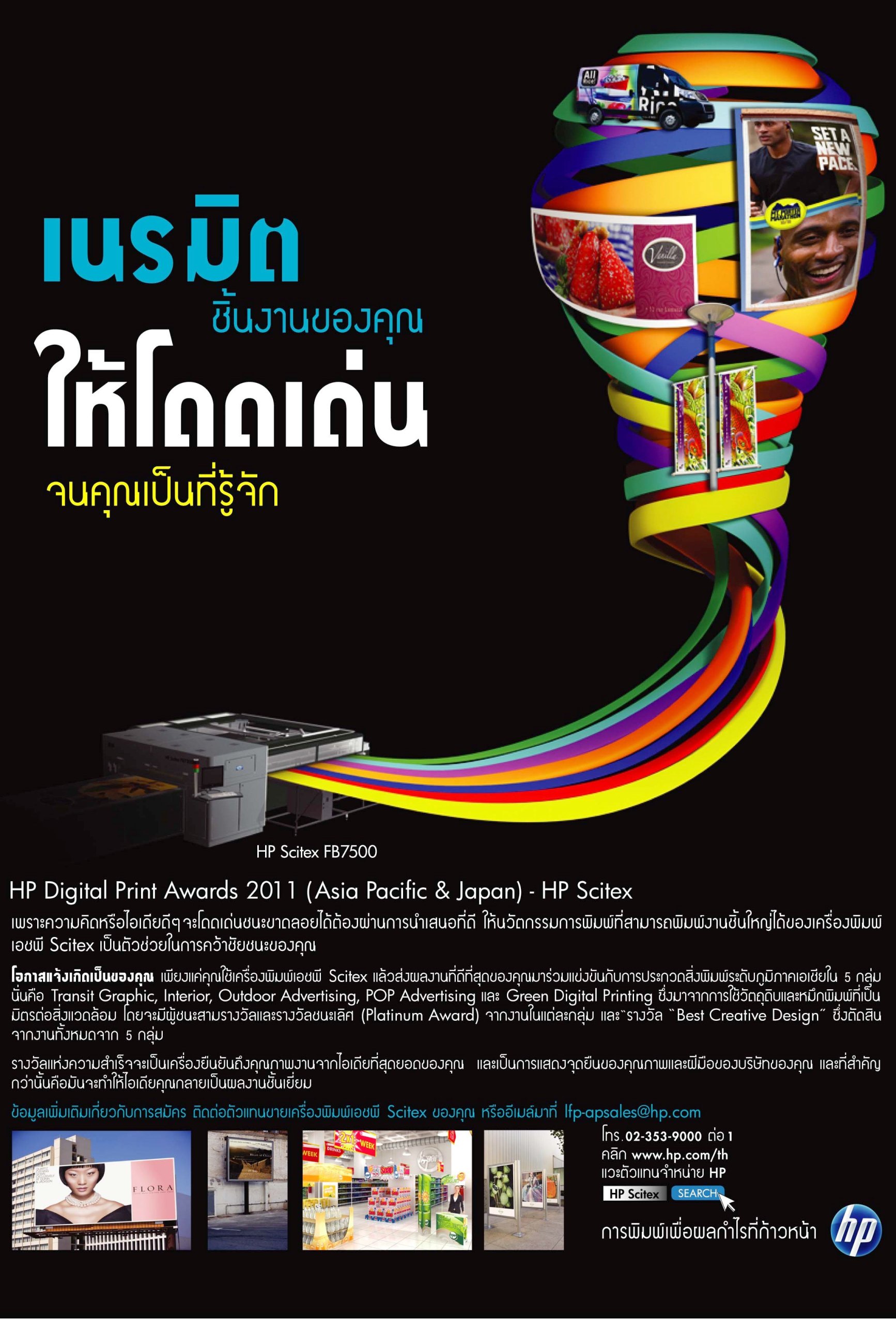 กรุงเทพฯ - 4 มีนาคม 2554 - เอ ชพีในฐานะผู้นำอันดับหนึ่งในอุตสาหกรรมการพิมพ์ ด้านกราฟฟิกในภูมิภาคเอเชียแปซิฟิก ประกาศรับผลงานร่วมประกวดรางวัลด้านการพิมพ์ระบบดิจิตอล ในอุตสาหกรรมทำป้ายสื่อโฆษณา ในภูมิภาคเอเชียแปซิฟิก ภายใต้ชื่อรางวัล “HP Digital Print Awards 2010 (Asia Pacific & Japan) - HP Scitex” โดยรางวัลนี้ก่อตั้งขึ้นในปีที่ผ่านมาเพื่อยกย่องความสำเร็จอันโดดเด่น และผลงานของผู้ให้บริการงานพิมพ์ (Print Service Providers: PSPs) ใน แวดวงการทำป้ายสื่อโฆษณาในภูมิภาคเอเชียแปซิฟิกและประเทศญี่ปุ่น ซึ่งงานกาล่าดินเนอร์ในค่ำคืนวันประกาศรางวัลที่จะมีการนำเอาผลงานที่ชนะนำ มาจัดแสดง โดยจะมีขึ้นพร้อมกันกับงานแสดงสินค้า Shanghai Int’l Ad & Sign Technology & Equipment Exhibition ครั้งที่ 19 ณ นครเซี่ยงไฮ้ สาธารณรัฐประชาชนจีน ในวันที่ 6 กรกฎาคม ศกนี้