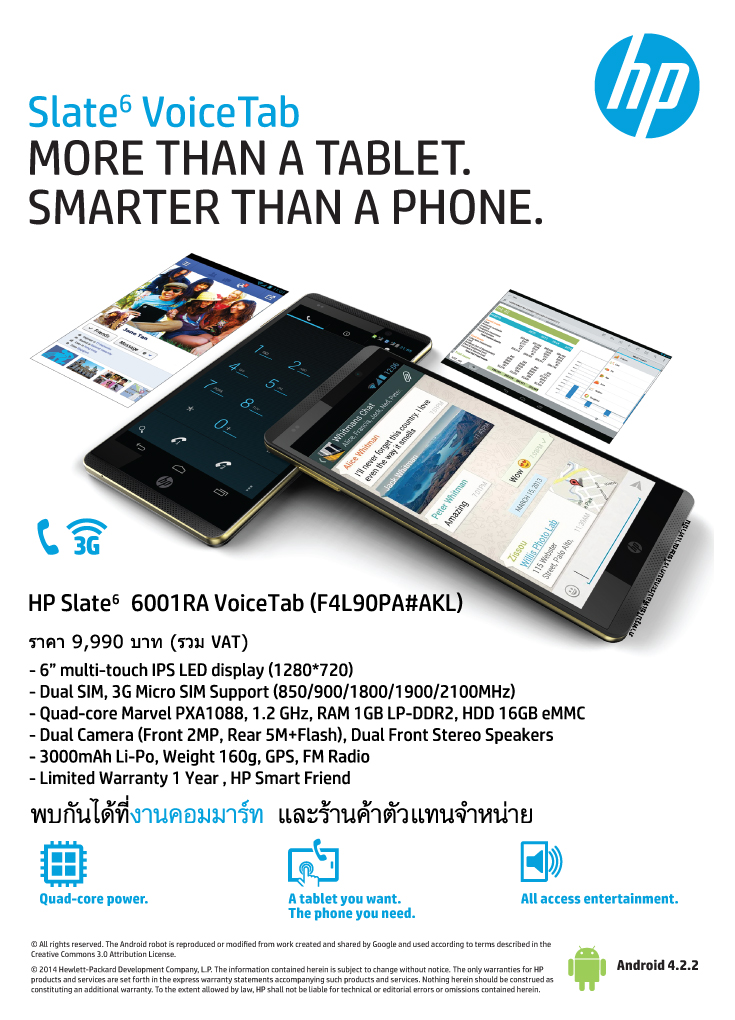 · เอชพี สเลท6 วอยซ์แท็บ (HP Slate6 VoiceTab) มีวางจำหน่ายแล้ว ในราคาเริ่มต้น 9,990 บาท (รวมภาษีมูลค่าเพิ่ม 7%) สอบถามข้อมูลเพิ่มเติมเกี่ยวกับผลิตภัณฑ์ใหม่ของเอชพี ได้ที่ www.hp.com
