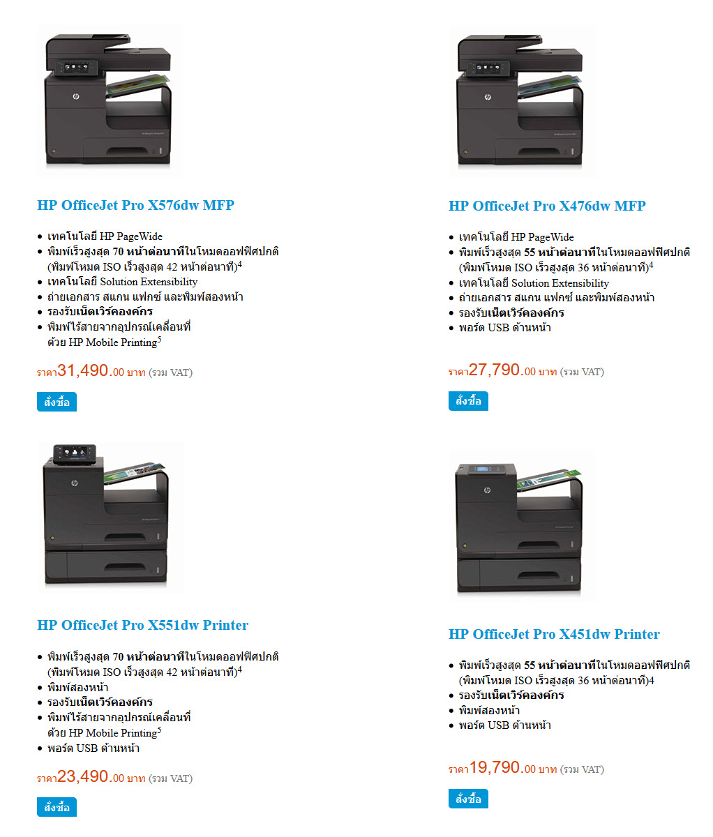 3 อ้างอิงจากความเร็วในการพิมพ์สูงสุดที่ได้รับการเผยแพร่สำหรับเครื่องพิมพ์ รุ่น HP X551dw และ X576dw เมื่อเปรียบเทียบกับเครื่องพิมพ์เลเซอร์ และเครื่องพิมพ์อิงค์เจ็ทสีตั้งโต๊ะแบบมัลติฟังก์ชั่นที่มีราคาต่ำกว่า 30,000 บาทและเครื่องพิมพ์ที่มีราคาต่ำกว่า 24,000 บาท ซึ่งตรวจสอบโดย WirthConsulting.org ในเดือนมกราคม 2556 ดูข้อมูลเพิ่มเติมได้ที่ hp.com/go/printerspeeds