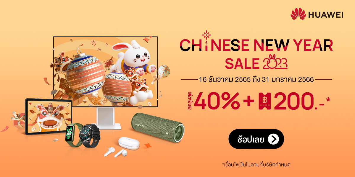16 มกราคม 2566, กรุงเทพฯ, ประเทศไทย - หัวเว่ย คอนซูมเมอร์ บิสสิเนส กรุ๊ป (ประเทศไทย) จัดโปรโมชันออนไลน์สุดพิเศษฉลองเทศกาลตรุษจีนต้อนรับปีกระต่ายทองกับแคมเปญ “Chinese New Year Sale 2023 Perfect Moments TOGETHER” ขนผลิตภัณฑ์ ทั้งแล็ปท็อป แท็บเล็ต สมาร์ทวอทช์ หูฟังไร้สาย ลำโพงไร้สาย และจอมอนิเตอร์ มอบส่วนลดสูงสุดถึง 40% พร้อมคูปองส่วนลดสูงสุดถึง 500 บาท ตั้งแต่ตั้งแต่ 16 มกราคม 2566 ถึง 31 มกราคม 2566 ที่เว็บไซต์ HUAWEI Store รวมถึงที่ร้านค้าอย่างเป็นการของหัวเว่ยบน Shopee และ Lazada