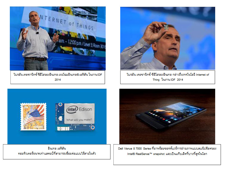 อินเทลเผยเทคโนโลยีใหม่สำหรับนักพัฒนา ทั้งแท็บเล็ต ระบบวิเคราะห์ข้อมูล อุปกรณ์ Wearables และพีซี ในงาน อินเทล ดิเวลล็อปเปอร์ ฟอรั่ม หรือ ไอดีเอฟ ประกาศว่าอินเทล® เอดิสัน และแพลทฟอร์ม LTE รุ่นที่สองมีวางจำหน่ายแล้ว