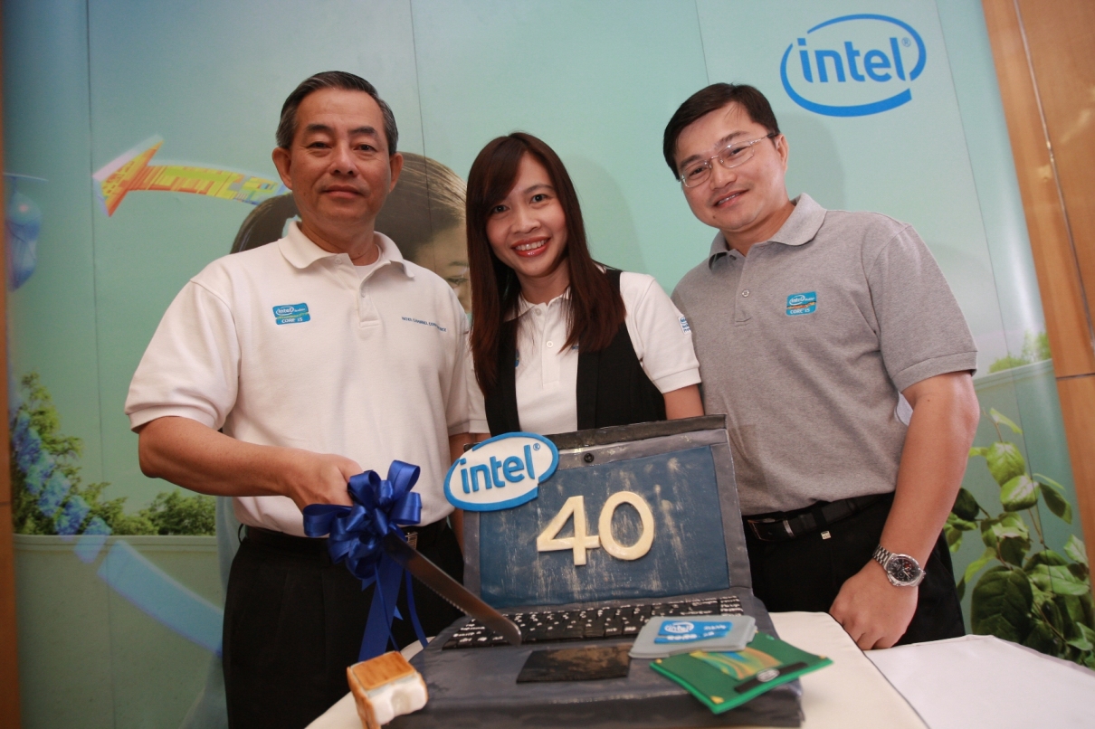 ผู้บริหารจากอินเทล (จากซ้ายไปขวา) นายเอกรัศมิ์ อวยสินประเสริฐ กรรมการผู้จัดการ นางดรรชนีพร พฤกษ์วัฒนานนท์ ผู้จัดการฝ่ายการตลาด และนายสนธิญา หนูจีนเส้ง ผู้จัดการฝ่ายขาย ตัดเค็กฉลองครบรอบ 40 ปี ไมโครโปรเซสเซอร์รุ่นแรกของโลก