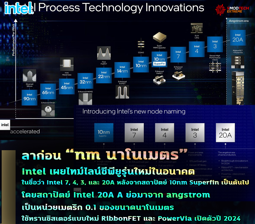 และในช่วงครึ่งหลังของปี 2023 Intel จะเปิดตัวสถาปัตย์ Intel 3 กับประสิทธิภาพที่เพิ่มขึ้น 18% ต่อวัตต์และจะมีไลบรารี HP ที่หนาแน่นขึ้น และจะใช้ EUV เพิ่มมากขึ้นอีกด้วยและสุดท้ายก็คือ สถาปัตย์ Intel 20A ซึ่งจะเปิดตัวในช่วงปลายปี 2024 โดย A ย่อมาจาก angstrom ซึ่งเป็นหน่วยเมตริก 0.1 ของขนาดนาโนเมตร และจะใช้สถาปัตยกรรมทรานซิสเตอร์แบบใหม่ที่เรียกว่า RibbonFET และนวัตกรรมการเชื่อมต่อระหว่างกันของ PowerVia แต่ทาง Intel ยังไม่ได้ยืนยันว่าผลิตภัณฑ์ใดจะใช้สถาปัตย์ Intel 20A ครับ ก็รอดูกันครับว่าทาง Intel จะเปิดเผยข้อมูลออกมาอีกอย่างไร เรากำลังจะก้าวข้ามสถาปัตย์ nm ไปแล้วในไม่อีกกี่ปีข้างหน้า น่าติดตามเลยครับ
