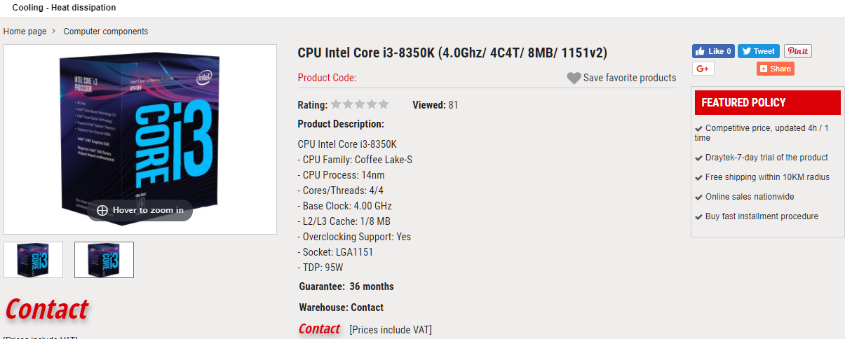 อินเทลเปิดสั่งจองพร้อมจำหน่ายซีพียูเจน 8th รุ่นใหม่ล่าสุดในโค๊ดเนม “Coffee Lake” ทั้ง 3รุ่นท๊อป Intel Core i7-8700K, Core i7-8600K, Core i3-8350K และรุ่นรองลงมาประมาณเดือนตุลาคมที่จะถึงนี้ โดยเว็บไซต์ซึ่งคาดว่าเป็นของประเทศจีนเริ่มเปิดรับสั่งจองซีพียูรุ่นดังกล่าวแล้ว โดยในแต่ละรุ่นมีดังนี้