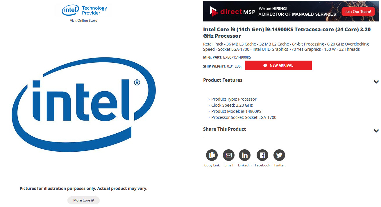 วันนี้ก็มีข่าวจากฝั่ง Intel หลุดออกมาให้เราได้ชมกันครับกับข่าวของซีพียู Intel Core i9-14900KS ที่หลุดมาจากร้านค้าขายปลีก directdial ที่ได้เผยให้เห็นสเปกการทำงานที่มีรายละเอียดข้อมูลเผยจำนวนคอร์ 24C/32T ความเร็วสูงสุด 6.2 GHz แคช 36 MB L3 Cache - 32 MB L2 Cache - 64-bit Processing -Socket LGA-1700 - Intel UHD Graphics 770 Yes Graphics - กินไฟ 150W TDP ราคาหน้าร้านอยู่ที่ 1005CAD เหรียญแคนนาดา ก็ถือเป็นข้อมูลที่ออกมาจากหน้าร้านค้าออนไลน์ที่น่าจะมีความเชื่อถือได้อยู่ไม่น้อยครับ ก็รอดูกันครับว่าข้อมูลจะตรงตามที่หลุดออกมาหรือไม่ น่าติดตามครับ
