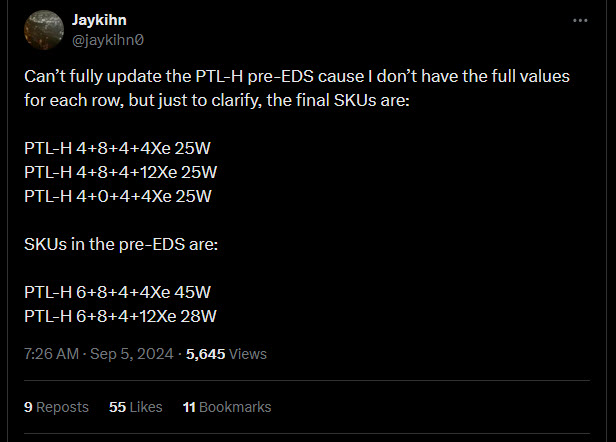 , PTL-H 4+8+4+12Xe 25 W , PTL-H 4+0+4+4Xe 25 W , PTL-H 6+8+4+4Xe 45 W , PTL-H 6+8+4+12Xe 28 W มากถึง 5รุ่น ซึ่งซีพียู Panther Lake-H จะถูกผลิตโดยใช้โหนดกระบวนการ 18A ที่ล้ำสมัยของ Intel ชิปดังกล่าวมีการผสมผสานระหว่างเทคโนโลยีคอร์แบบ Cougar Cove P-Cores, Skymont E-Cores และกราฟิกรวม Xe3 (Celestial) สถาปัตยกรรมนี้สร้างขึ้นจากการออกแบบไฮบริดคอร์ของ Intel ซึ่งได้รับการปรับแต่งเพื่อประสิทธิภาพที่ดียิ่งขึ้นบนอุปกรณ์พกพาหรือบรรดาแล้ปท็อป ข้อมูลที่รั่วไหลออกมาบ่งบอกถึงการกำหนดค่าต่างๆ สำหรับซีพียู Panther Lake-H ซึ่งเป็นรุ่นที่มีประสิทธิภาพสูงของกลุ่มผลิตภัณฑ์แล้ปท็อปมีบรรดารุ่นที่มีจำนวนคอร์และสเปกที่แตกต่างกัน กินไฟอยู่ระหว่าง 25 W - 45 W โดย Intel ซีรีส์ Panther Lake คาดว่าจะเปิดตัวในช่วงครึ่งหลังของปี 2025