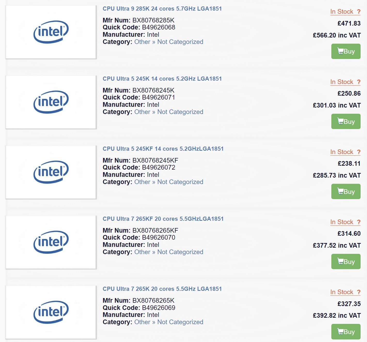 หลุดซีพียู Intel Core Ultra 9 285K , Core i7 265K(F) และ Core i5 245K(F) วางจำหน่ายในร้านค้าออนไลน์