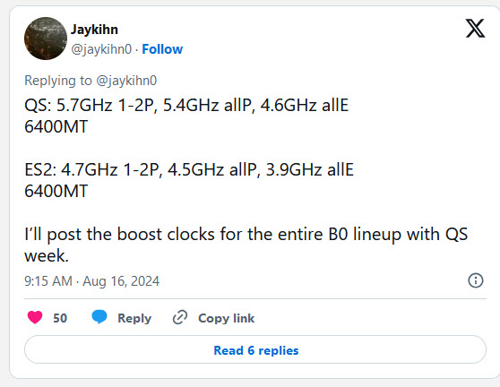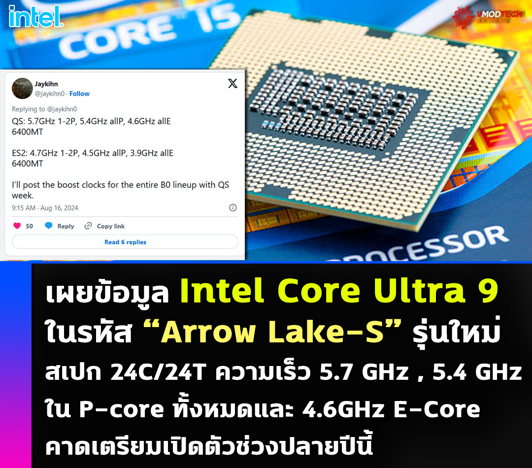 วันนี้ก็มีข่าวจากฝั่ง Intel หลุดออกมาให้เราได้ชมมกันครับกับข่าวของซีพียู Intel Core Ultra 9 ในรหัส “Arrow Lake-S” รุ่นใหม่ที่เป็นรุ่น QS (Qualification Simple) ที่ได้รับการเปิดเผยจากทาง @jaykihn0 ที่เผยสเปกการทำงานจำนวนคอร์ 24C/24T มีความเร็ว 5.7 GHz, 5.4 GHz และใช้ P-core ทั้งหมด และ 4.6Ghz E-Core แต่สำหรับรุ่น ES2 ความเร็ว 4.7GHz 1-2P, 4.5GHz allP, 3.9GHz allE บัสแรม 6400MT ก็ถือเป็นข้อมูลที่หลุดออกมาอย่างไม่เป็นทางการนะครับ ซึ่งการเปิดตัวก็คาดว่าจะมีขึ้นในช่วงปลายปีเดือนตุลาคมที่จะถึงนี้