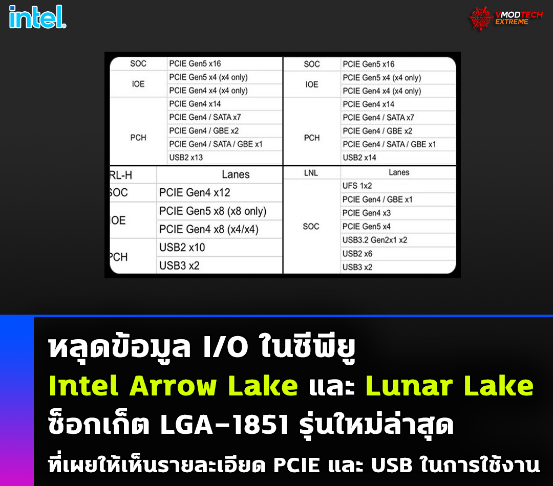หลุดข้อมูล I/O ในซีพียู Intel Arrow Lake และ Lunar Lake ซ็อกเก็ต LGA-1851 รุ่นใหม่ล่าสุดที่เผยให้เห็นรายละเอียด PCIE และ USB ในการใช้งาน