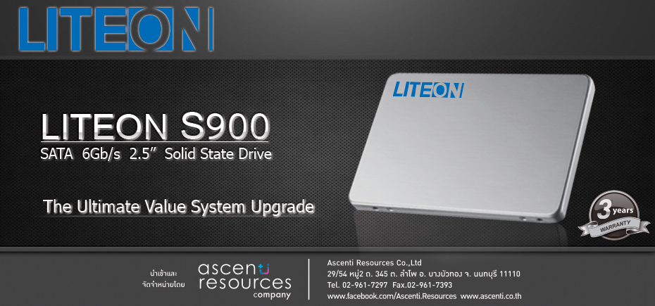 สำหรับ LITEON S900 Series รับประกัน 3 ปี จากบริษัทเอสเซนตี้ รีซอร์สเซส จำกัด ผู้นำเข้า และจัดจำหน่าย LITEON SSD รายเดียวของประเทศไทย