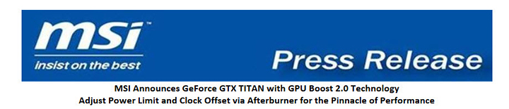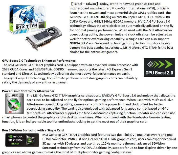 MSI ทำการเปิดตัวกราฟฟิกการ์ดรุ่นใหม่ GeForce GTX TITAN ที่มาพร้อมกับเทคโนโลยี GPU Boost 2.0 ที่สามารถปรับพาวเวอร์ลิมิตและคล๊อกออฟเซ็ตผ่านทาง MSI Afterburner เพื่อบรรลุถึงประสิทธิภาพสูงสุดของการ์ด