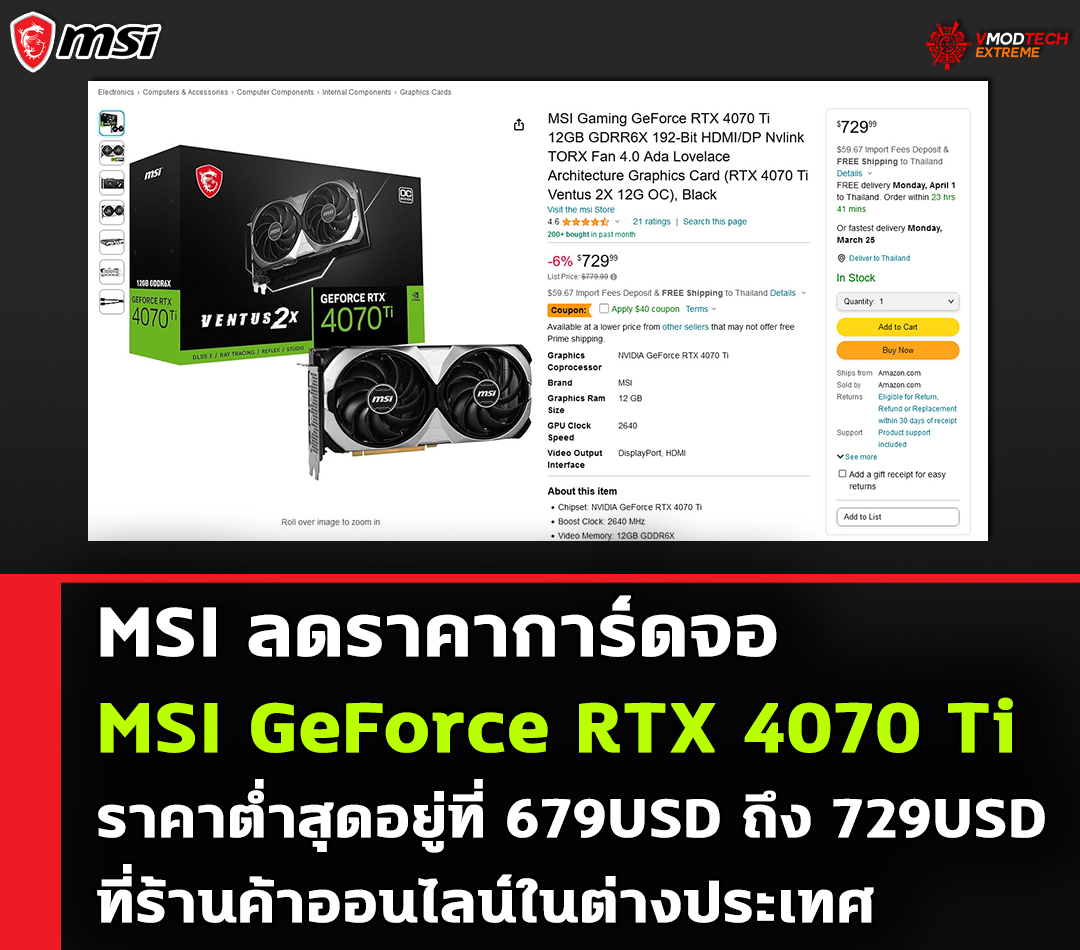 วันนี้ก็มีข่าวจากฝั่ง MSI หลุดออกมาให้เราได้ชมกันครับกับข่าวของการ์ดจอ MSI GeForce RTX 4070 Ti ที่วางจำหน่ายในร้านค้าออนไลน์ของต่างประเทศได้ทำการลดราคาลงมากถึง 679USD ไปจนถึง 729USD ตามรุ่น โดยใช่ส่วนลดคูปอง โดยที่เว็บไซต์ของทาง Newegg และ Amazon ได้ปรับลดราคาลงซึ่งเป็นราคาที่น่าสนใจมากกับการ์ดจอในรุ่น MSI Gaming GeForce RTX 4070 Ti 12GB GDRR6X , MSI Vantus GeForce RTX 4070 Ti 12GB GDRR6X ซึ่งราคานี้เป็นราคาเมืองนอกแต่ถ้าพิจารณาแล้วก็น่าจะมีค่าขนส่งบวกภาษีอีก แต่ถ้าใครบวกลบแล้วคุ้มค่าก็ลองพิจารณากันดูครับ