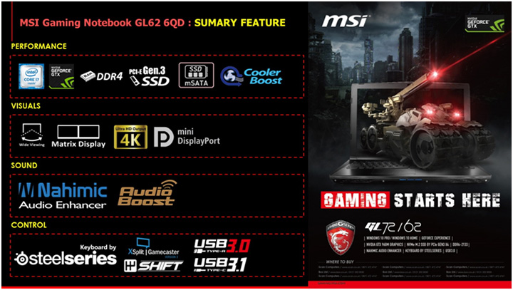 จุดเด่นของ MSI Gaming Notebook GL62 :