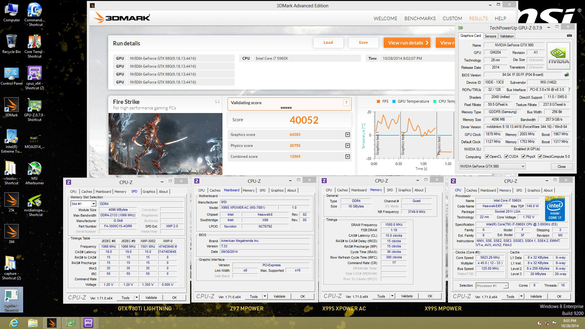 The MSI X99S XPOWER AC, one of MSI’s new Intel X99 based OC motherboards, just obliterated the 3DMark - Fire Strike world record with scoring a staggering 40052 marks together with a 4-way MSI GTX 980 GAMING 4G setup. MSI, with the help of overclockers 8 Pack from OC UK and Pepinorang, is the first manufacturer scoring over 40000 marks in 3DMark Fire Strike.