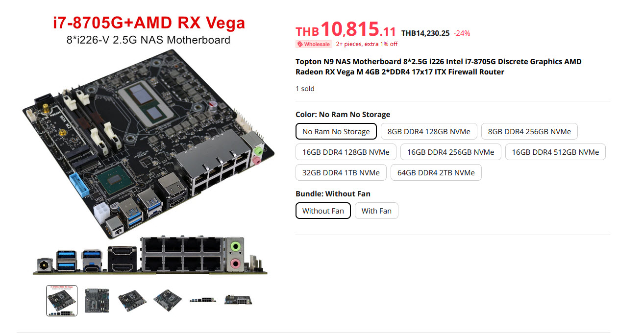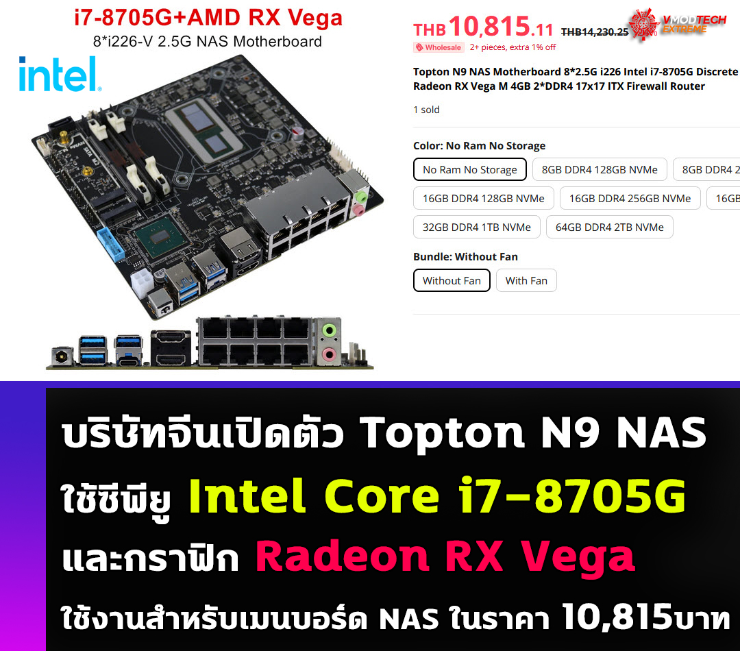 วันนี้ก็มีข่าวจากฝั่งประเทศจีนออกมาให้ได้ชมกันอีกครับกับการประกาศวางจำหน่ายเมนบอร์ด NAS รุ่นใหม่ของทาง Topton ที่วางจำหน่ายชุดเมนบอร์ด NAS รุ่นใหม่ในรุ่น Topton N9 NAS Motherboard ที่มาพร้อมซีพียู Intel Core i7-8705G ที่มาพร้อมกราฟิก RX Vega โดยสเปกการทำงานประกอบด้วย 2.5G i226 Intel i7-8705G Discrete Graphics AMD Radeon RX Vega M 4GB 2*DDR4 17×17 ITX Firewall Router โดยมีรุ่นให้เลือกแรมมากมายราคาอยู่ที่ 10815บาท ซึ่งซีพียู Intel Core i7-8705G เป็นซีพียูขนาด 14nm รุ่นรหัส Kaby Lake G เจนเนเรชั่นที่ 8 ที่ออกมาในช่วงปี 2018 ถือเป็นซีพียู Intel ที่ใช้งานร่วมกับกราฟฟิกจากทาง Radeon RX Vega เป็นรุ่นแรกๆ เลยก็ว่าได้ครับ