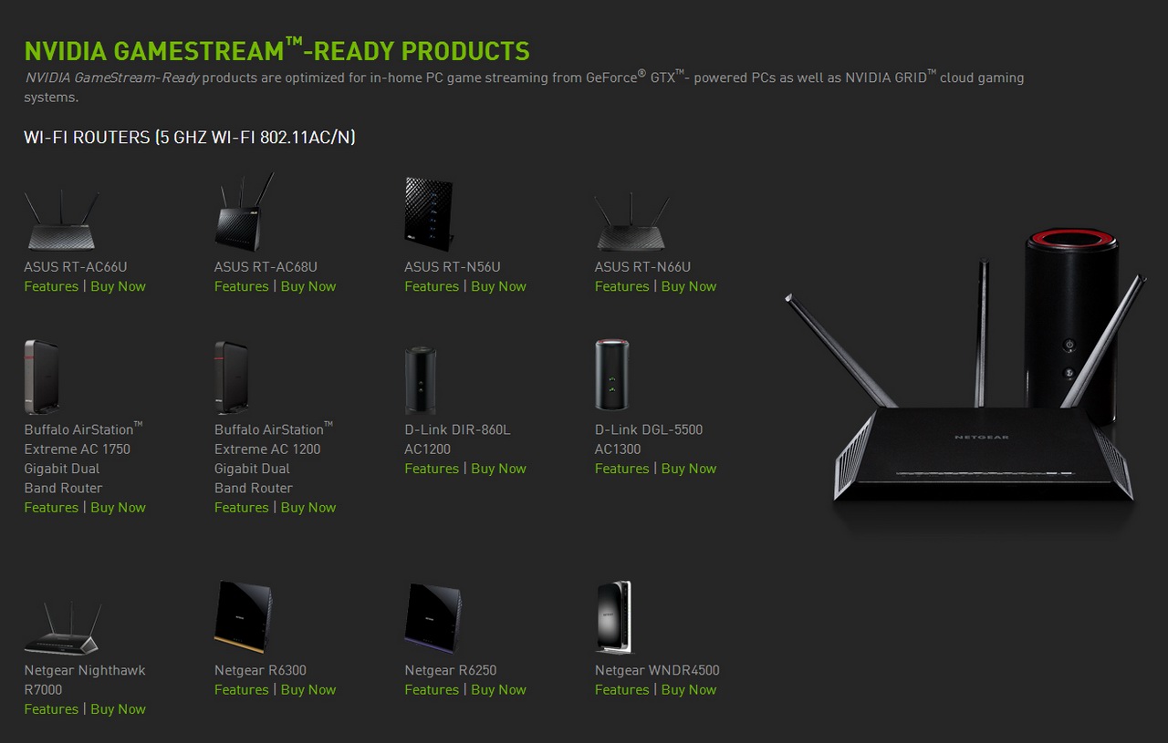 NVIDIA GameStream-ready routers คือ router ถูกปรับแต่งเป็นพิเศษ เพื่อให้การเล่นเกมส์ภายในบ้านของท่านไหลลื่น ไม่สะดุด เมื่อทำการ stream game ผ่านPC ที่ประกอบไปด้วย ระบบกราฟิก GeForce GTX หรือ NVIDIA GRID cloud game streaming. Router ที่ผ่านการรับรองแล้วได้แก่