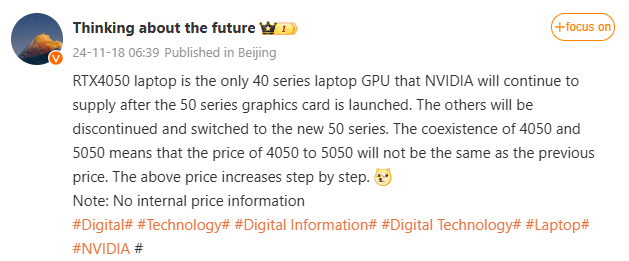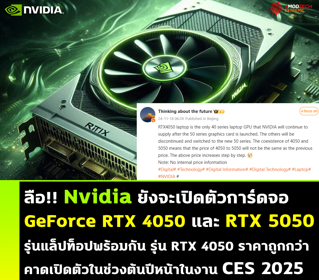 วันนี้ก็มีข่าวจากฝั่ง nvidia หลุดออกมาให้เราได้ชมกันครับกับข่าวของการ์ดจอ GeForce RTX 4050 รุ่นแล็ปท็อปที่มีข่าวเงียบไปและยังไม่มีวี่แววว่าจะเปิดตัวลงสู่ตลาดแล็ปท็อป แต่วันนี้มีรายงานจากทาง Weibo ออกมาครับกับการที่ Nvidia จะเปิดตัวการ์ดจอ GeForce RTX 4050 รุ่นแล็ปท็อปลงสู่ตลาดในอนาคตจพร้อมกับการ์ดจอ RTX 5050 “Blackwell” รุ่นแล็ปท็อปในเวลาที่ใกล้เคียงกันพร้อมกับวางจำหน่ายแยกรุ่น โดยในรุ่น RTX 4050 จะราคาถูกกว่า แต่ในรุ่น RTX 5050 ก็จะมีราคาที่สูงกว่าที่ลงในรุ่นแล้ปท็อปในแบรนด์ต่างๆ สำหรับการเปิดตัวนั้นคาดว่าจะมีขึ้นในงาน CES 2025 ต้นปีหน้าครับ