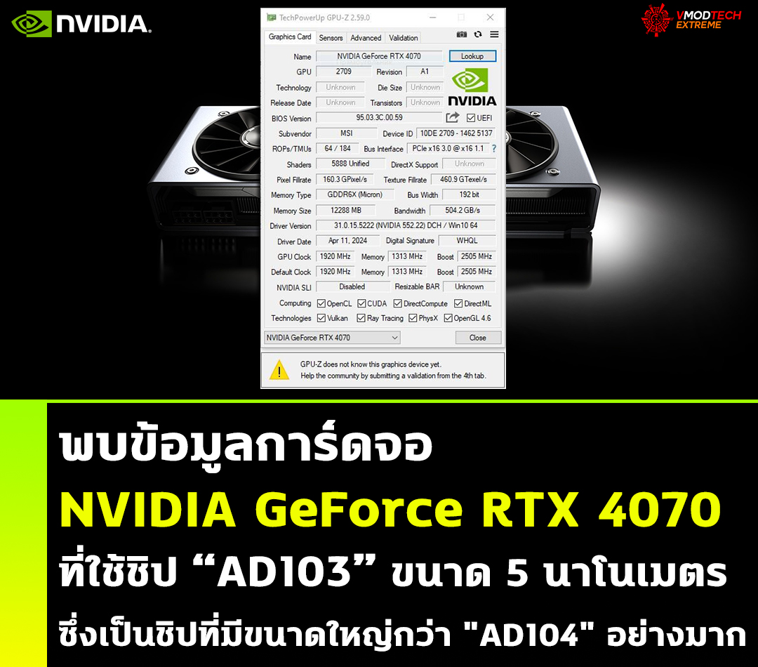 พบข้อมูลการ์ดจอ NVIDIA GeForce RTX 4070 ที่ใช้ชิป AD103 ขนาด 5 นาโนเมตร ซึ่งเป็นชิปที่มีขนาดใหญ่กว่า “AD104″ อย่างมาก