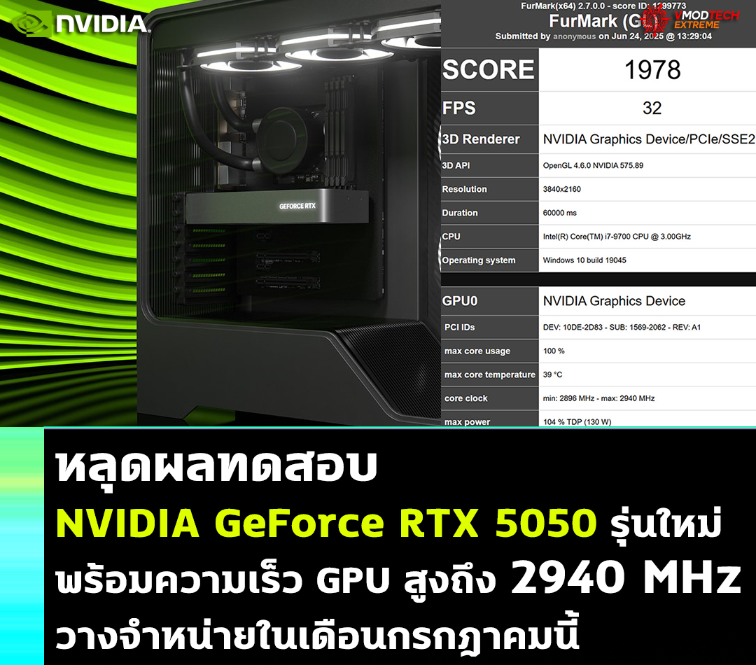วันนี้ก็มีข่าวจากฝั่ง nvidia หลุดออกมาให้เราได้ชมกันครับกับข่าวของการ์ดจอ NVIDIA GeForce RTX 5050 รุ่นใหม่ที่พึ่งเปิดตัวไปได้ไม่นานแต่ยังไม่มีผลทดสอบกับการมีผลทดสอบ Furmark พร้อมความเร็ว GPU สูงถึง 2940 MHz กันเลยทีเดียว โดยการ์ดจอรุ่นดังกล่าวเป็นของแบรนด์ PALIT ทำคะแนนอยู่ที่ 1978คะแนน เฟรมเรทที่ 32FPS สำหรับการวางจำหน่ายของ NVIDIA GeForce RTX 5050 จะมีขึ้นในเดือนกรกฎาคมนี้
