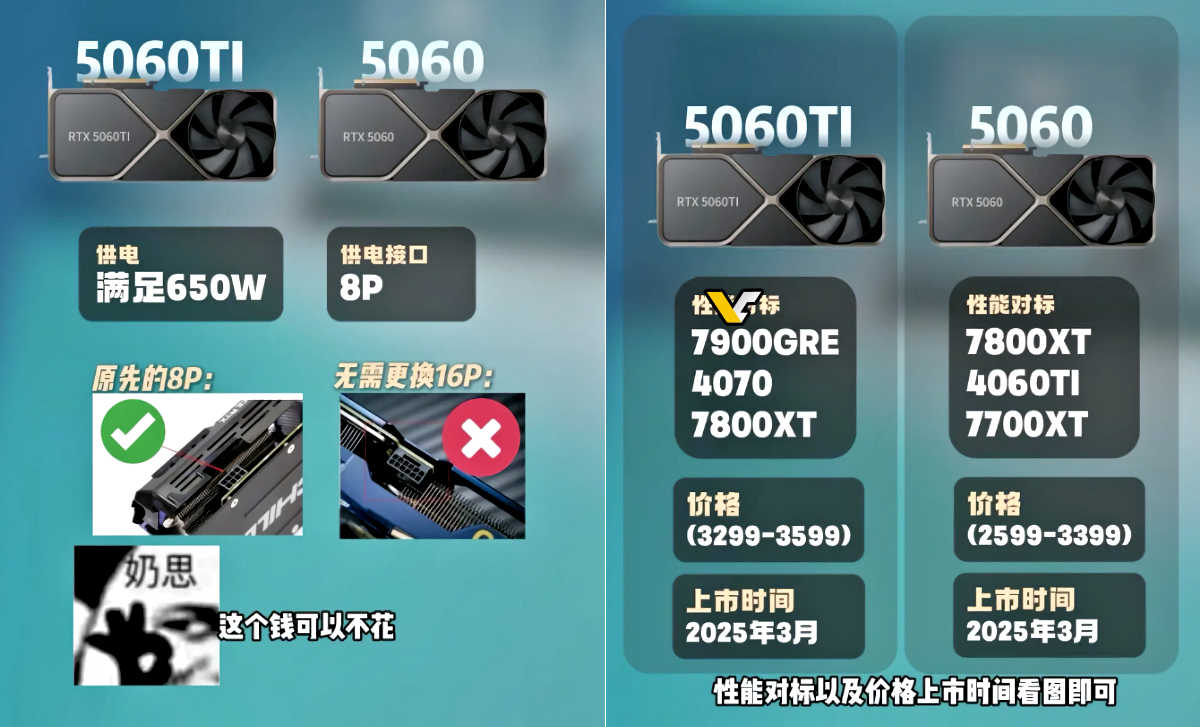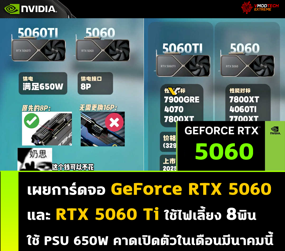 วันนี้ก็มีข่าวจากฝั่ง Nvidia จากการเปิดเผยของทาง Doyin ที่ได้เผยว่าการ์ดจอ Nvidia GeForce RTX 5060 และ 5060 Ti ใช้ไฟเลี้ยง 8พิน ใช้เพาวเวอร์ซัพพลาย 650W จากภาพกราฟฟิกที่ออกมา รวมทั้งได้เผยราคาที่ออกมาของ RTX 5060 Ti ที่อยู่ที่ 3299-3599หยวน และ RTX 5060 ราคาอยู่ที่ 2599-3399 หยวน การเปิดตัวจะมีขึ้นในช่วงเดือนมีนาคมนี้