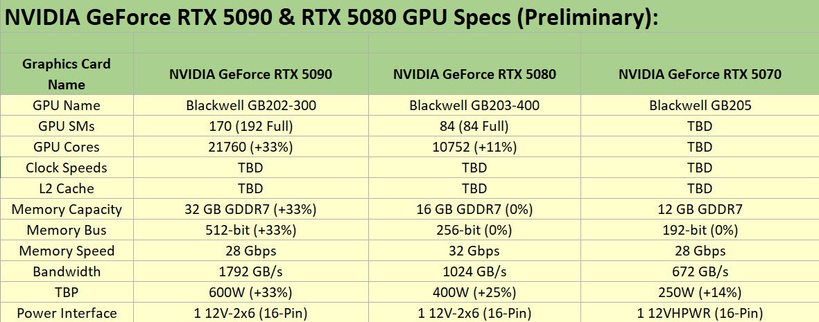 โดยรุ่นท็อปสุดจะเป็น NVIDIA GeForce RTX 5090 ซึ่งจะเป็นชิปตัวท็อปของกลุ่มผลิตภัณฑ์ กราฟิกการ์ดคาดว่าจะมีการออกแบบ PCB PG144/145-SKU30 และจะรวมแกน GPU GB202-300-A1 GPU จะมี 170 SMs ที่เปิดใช้งานจากทั้งหมด 192 SMs และจะมี 21760 cores แทนที่จะเป็น 24,576 cores ทั้งหมด การ์ดจอ RTX 5080 จะใช้ PCB PG144/147-SKU45 และจะรวม Die GB203-400-A1 GPU จะใช้ชิป GPU GB203 เต็มรูปแบบที่มี 84 SM และ 10,752 คอร์ และการ์ดจอ NVIDIA GeForce RTX 5070 กราฟิกการ์ดนี้จะมาพร้อมกับ GB205 GPU บน PCB ในรหัส PG147 ซึ่งการเปิดตัวคาดว่าจะมีขึ้นในต้นปี 2025